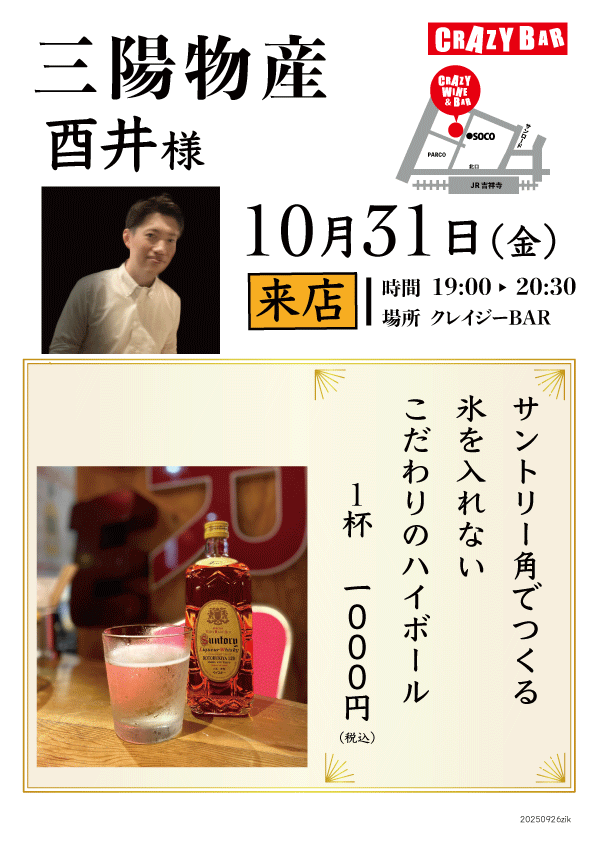 三陽物産 酉井氏が1日限定でクレイジーBARに来店!『サントリー角で作る氷を入れないこだわりのハイボール』を提供してくれます。この機会に特別な一杯を堪能してみてはいかがでしょうか。